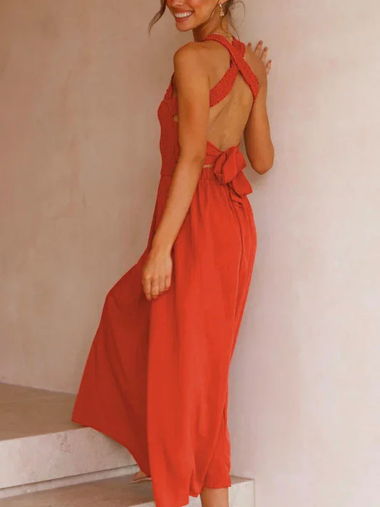 Playful Feminine A-line Midi Dress with Halter Neckline and Pleated Skirt
