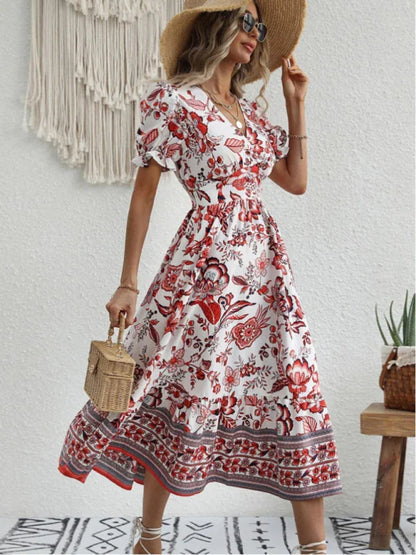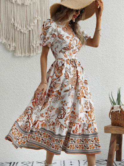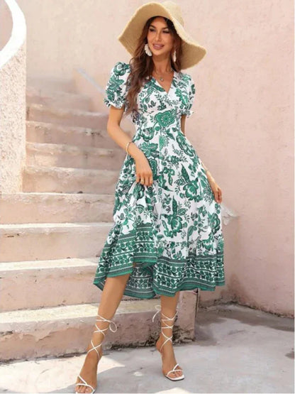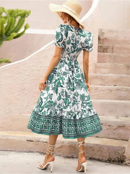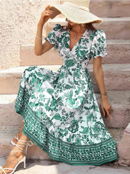 Picture yourself gliding into the evening, wrapped in the refined beauty of this Women's A-Line Maxi V-Neck Printed Casual Dress masterpiece from LeStyleParfait. Designed for your most enchanting summer casual moments, its captivating V-neck and graceful puff sleeves drape like poetry against your skin.