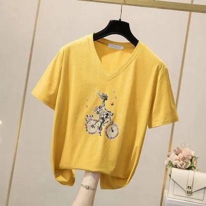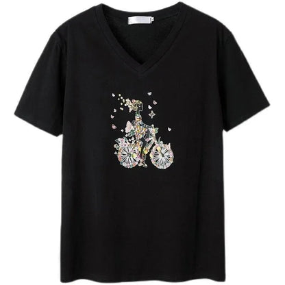 Top up your casual wardrobe with a cycler-print t-shirt for women that sports a trendy cycle print. Crafted with a simple V-neck collar this t-shirt has a trendy and unique pattern. Get ready to elevate your style game with this cycler-print t-shirt for women! Featuring a trendy cycle print and a simple V-neck collar, this shirt is guaranteed to turn heads and make a statement. Embrace your passion for cycling and showcase your unique style with this one-of-a-kind pattern. Perfect for casual wear, this t-shirt is both comfortable and stylish. Don't settle for plain and boring t-shirts anymore. Upgrade to this cycler-print shirt and make the difference!