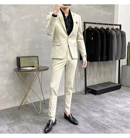 This men's business suit is a smart-casual piece that can be worn all year round. It features a solid-color pattern, long sleeves, a single-breasted closure, a back center-slit rear vent, and is crafted from cotton. It also has a slim edition type.