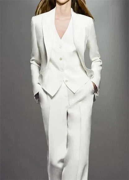 Indulge in elegance with the White Formal Three-Piece Pantsuit for Women from LeStyleParfait. Perfectly tailored for weddings, formal business occasions, and beyond, this ensemble exudes confidence and sophistication. Featuring a stylish double-breasted blazer, a V-neck vest, and tailored trousers, this pantsuit is crafted with lightweight, breathable fabrics, including cotton, polyester, and spandex, to keep you comfortable all day long. The plain-solid pattern and polished buttons add timeless charm, while the snug-fitting long sleeves and zipper-fly closure create a flattering, modern silhouette.